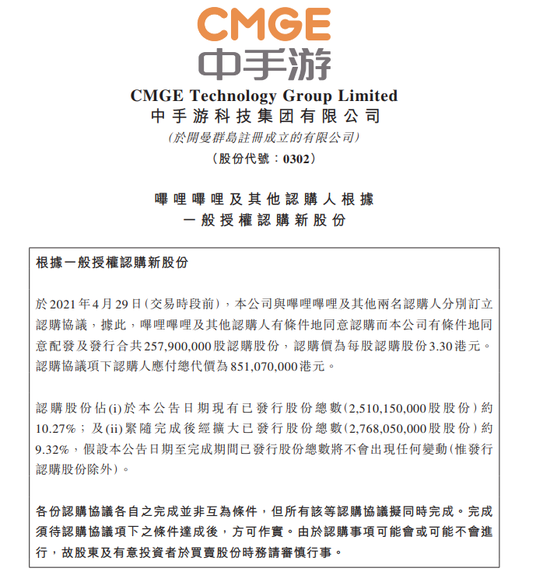 中手游在港交所公告称,与哔哩哔哩及其他两名认购人订立认购协议,后者同意认购公司配发及发行2.58亿股股票,认购价为3.3港元/股,总计8.51亿港元。
